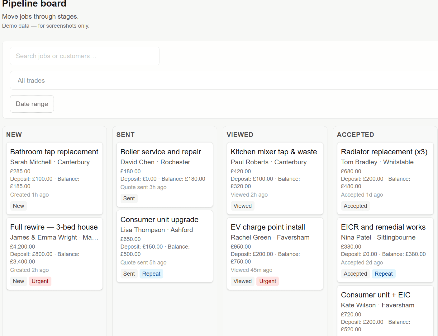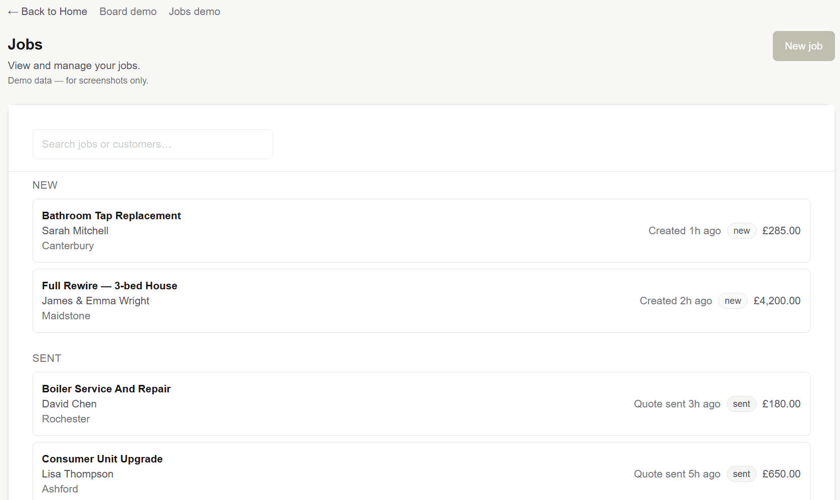 - Stay organised: every quote becomes a job (notes, photos, invoices).