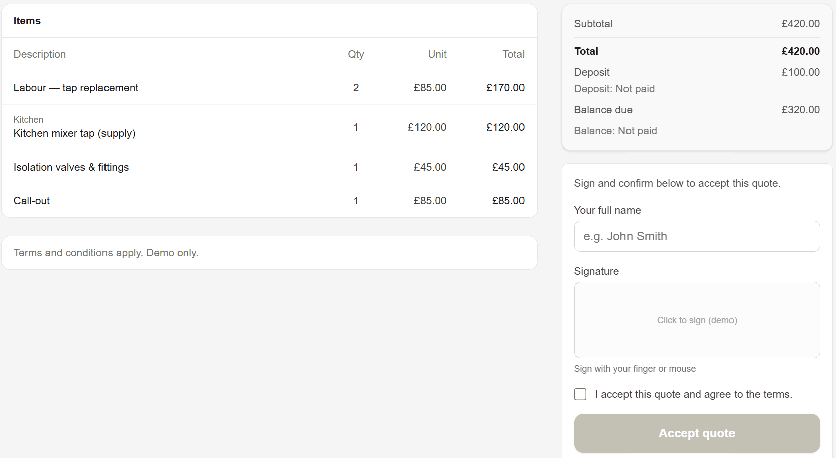 No PDFs. No logins. Customer opens, signs to accept, and pays.